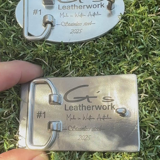 My own designed buckles available in two shapes. Oval and rectangular. The size of the buckles is 80x50mm and casted in a Hong Kong cast house by means of lost wax casting. Solid 304 stainless steel with a brushed look finish.